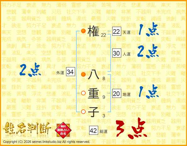 画数の奇数(○陽)と偶数(●陰)の配列で吉凶を占います。どちらかにかたよる名前は大凶名で避ける必要があります。画数の奇数偶数。