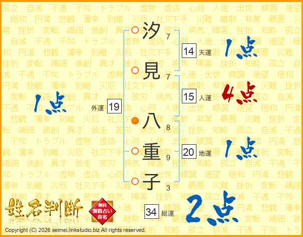 汐(7画)見(7画) 八(8画)重(9画)子(3画)