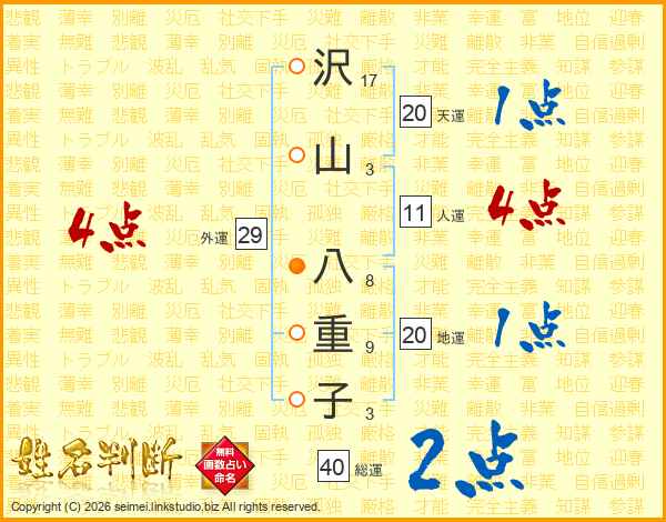 沢(17画)山(3画) 八(8画)重(9画)子(3画)