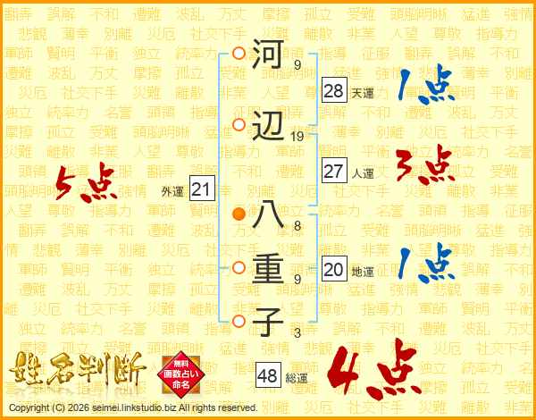 河(9画)辺(19画) 八(8画)重(9画)子(3画)