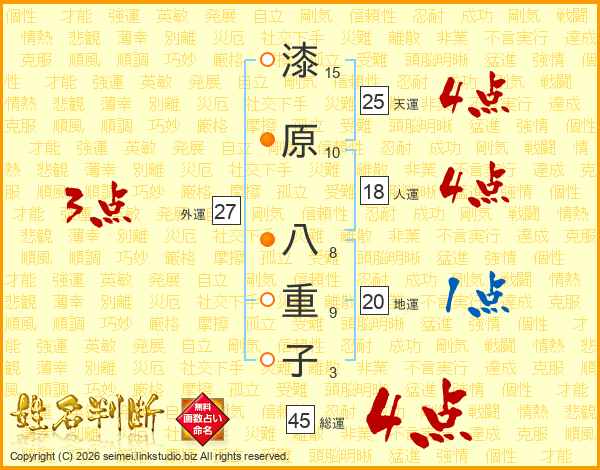 漆(15画)原(10画) 八(8画)重(9画)子(3画)