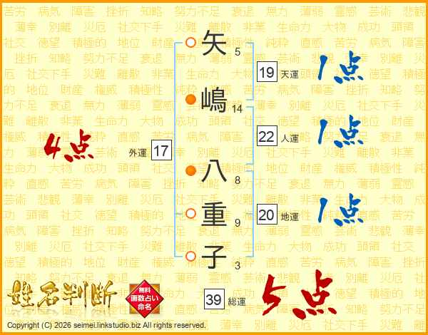 矢嶋八重子さんの総運は39画の5点!