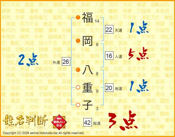 福(14画)岡(8画) 八(8画)重(9画)子(3画)