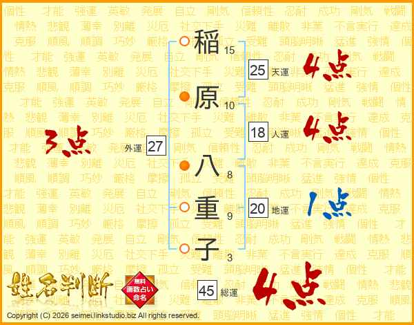 稲(15画)原(10画) 八(8画)重(9画)子(3画)