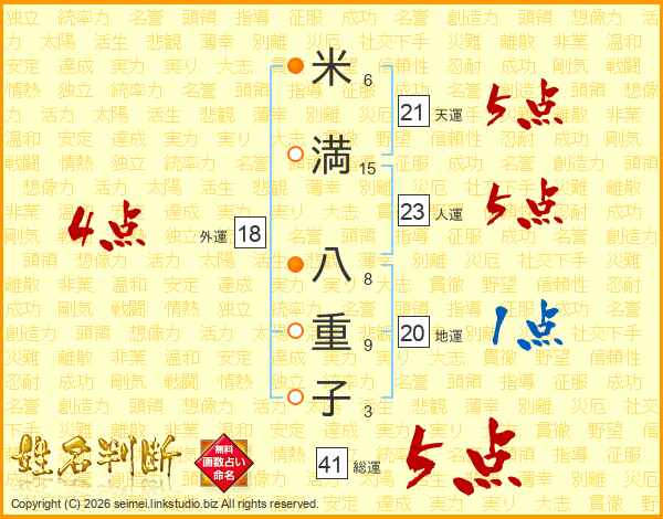 米(6画)満(15画) 八(8画)重(9画)子(3画)