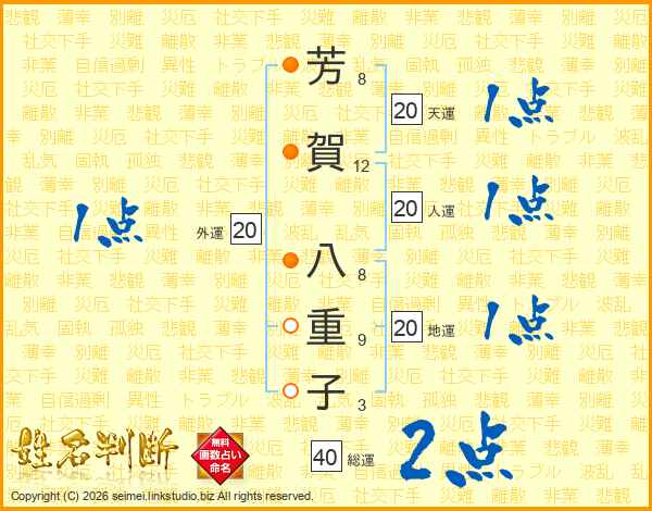 芳(8画)賀(12画) 八(8画)重(9画)子(3画)