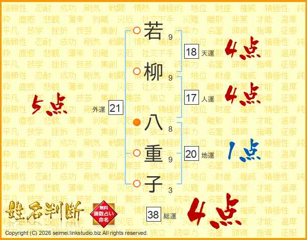 生活面を象徴する運勢です。外部から受ける影響力を表し、結婚運、家庭運や職場、環境への順応性を表します。総運から人運を引いた画数。姓や名が1文字の場合を除く。