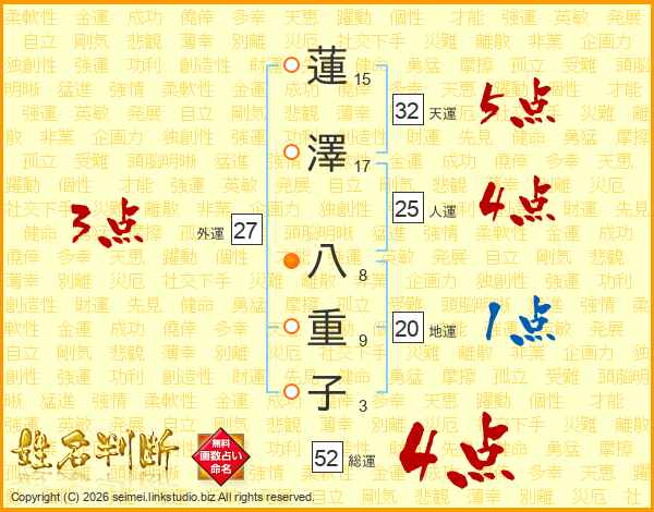 蓮(15画)澤(17画) 八(8画)重(9画)子(3画)