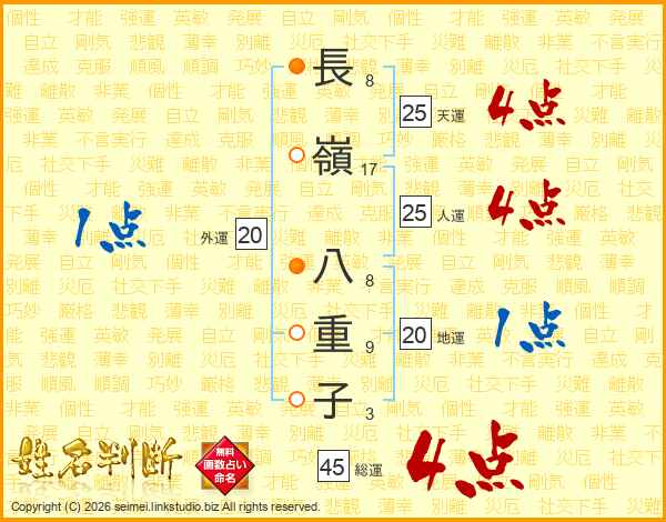 長(8画)嶺(17画) 八(8画)重(9画)子(3画)