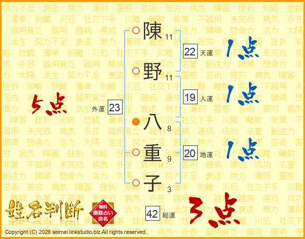 陳(11画)野(11画) 八(8画)重(9画)子(3画)