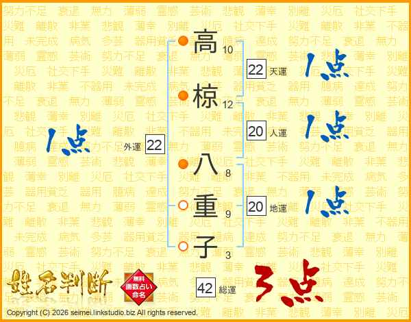 高(10画)椋(12画) 八(8画)重(9画)子(3画)