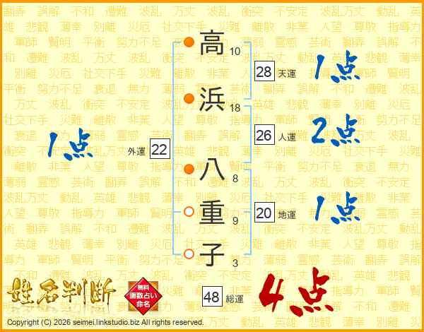 高(10画)浜(18画) 八(8画)重(9画)子(3画)