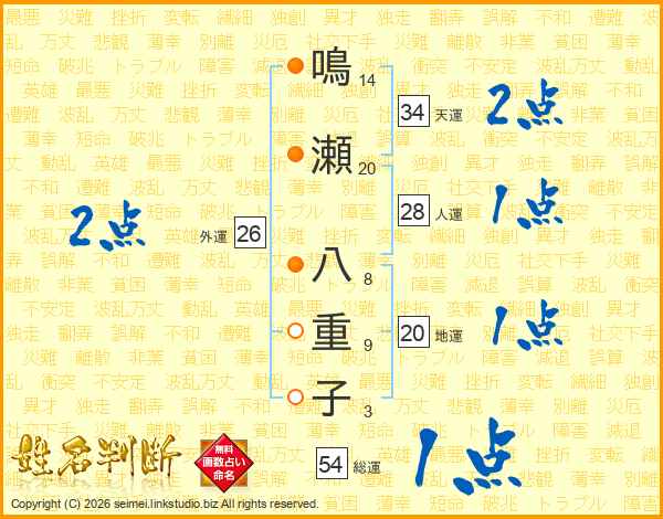 鳴(14画)瀬(20画) 八(8画)重(9画)子(3画)