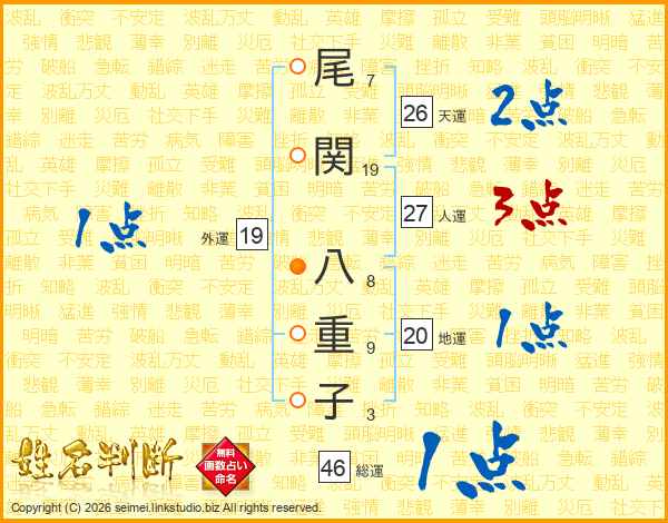 尾(7画)関(19画) 八(8画)重(9画)子(3画)