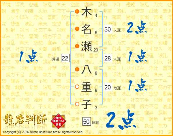 木(4画)名(6画)瀬(20画) 八(8画)重(9画)子(3画)