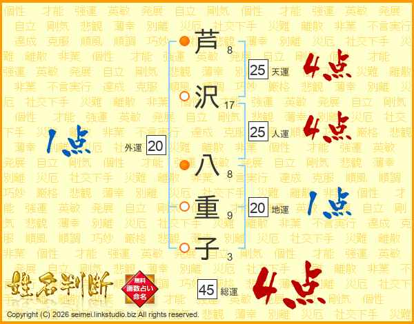 芦(8画)沢(17画) 八(8画)重(9画)子(3画)