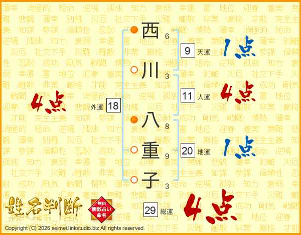 西(6画)川(3画) 八(8画)重(9画)子(3画)