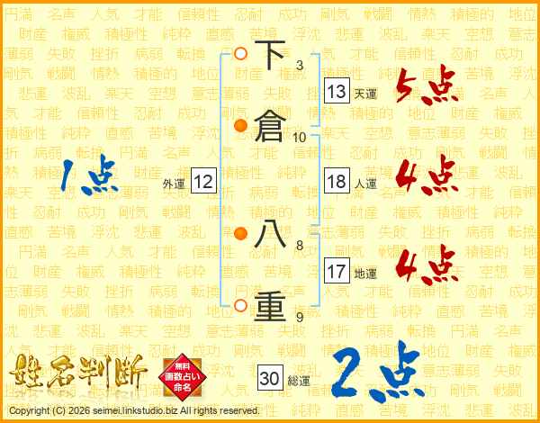 生活面を象徴する運勢です。外部から受ける影響力を表し、結婚運、家庭運や職場、環境への順応性を表します。総運から人運を引いた画数。姓や名が1文字の場合を除く。