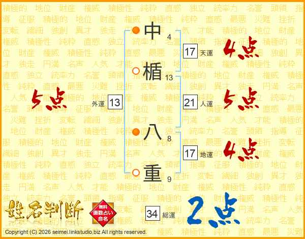 生活面を象徴する運勢です。外部から受ける影響力を表し、結婚運、家庭運や職場、環境への順応性を表します。総運から人運を引いた画数。姓や名が1文字の場合を除く。