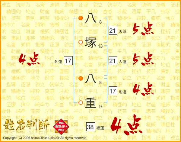 生活面を象徴する運勢です。外部から受ける影響力を表し、結婚運、家庭運や職場、環境への順応性を表します。総運から人運を引いた画数。姓や名が1文字の場合を除く。