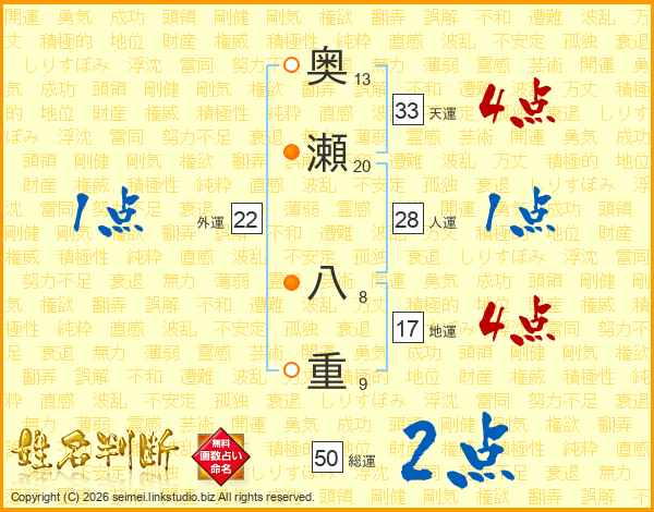 奥(13画)瀬(20画) 八(8画)重(9画)