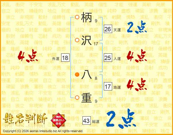 家系が持つ宿命的な運勢を表します。祖先から受け継いだ苗字ですので自分の力が及びません。家柄を象徴します。苗字の合計画数。