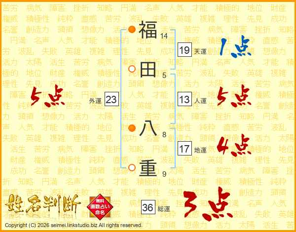 生活面を象徴する運勢です。外部から受ける影響力を表し、結婚運、家庭運や職場、環境への順応性を表します。総運から人運を引いた画数。姓や名が1文字の場合を除く。