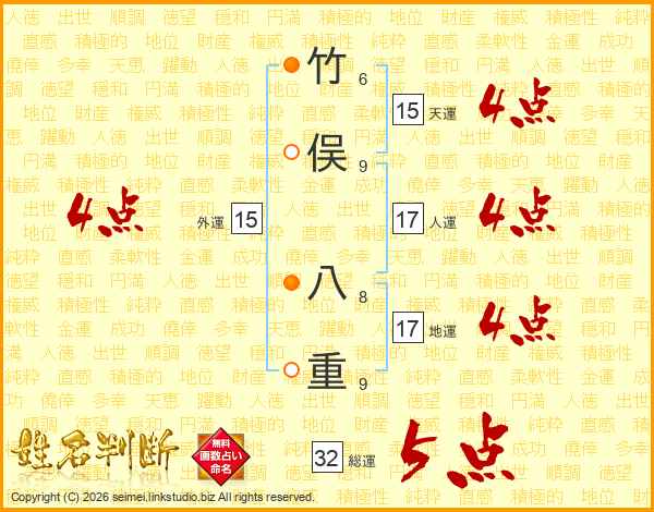 生活面を象徴する運勢です。外部から受ける影響力を表し、結婚運、家庭運や職場、環境への順応性を表します。総運から人運を引いた画数。姓や名が1文字の場合を除く。