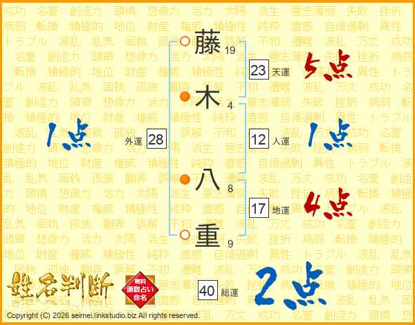 生活面を象徴する運勢です。外部から受ける影響力を表し、結婚運、家庭運や職場、環境への順応性を表します。総運から人運を引いた画数。姓や名が1文字の場合を除く。