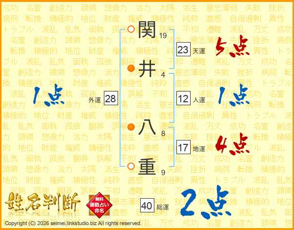 生活面を象徴する運勢です。外部から受ける影響力を表し、結婚運、家庭運や職場、環境への順応性を表します。総運から人運を引いた画数。姓や名が1文字の場合を除く。