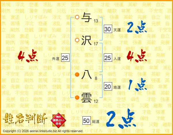 与沢八雲さんの人運は25画の4点!