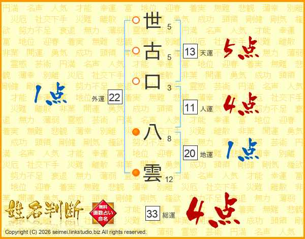 世古口八雲さんの総運は33画の4点!