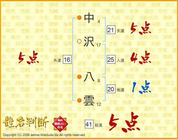 中沢八雲さんの総運は41画の5点!