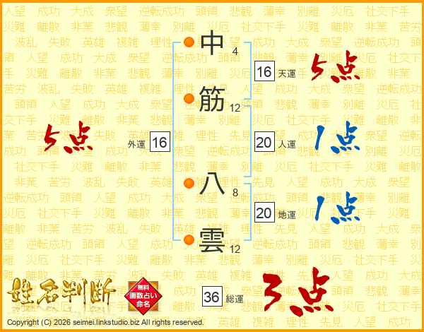 あなたの人生を表す1番重要な運勢です。生涯を通じて影響する総合運となり、主に50歳以降の晩年期に影響を及ぼします。苗字と名前の合計画数。
