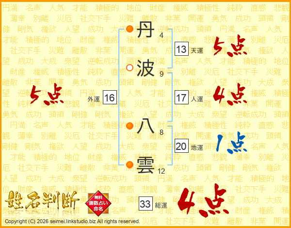 生活面を象徴する運勢です。外部から受ける影響力を表し、結婚運、家庭運や職場、環境への順応性を表します。総運から人運を引いた画数。姓や名が1文字の場合を除く。