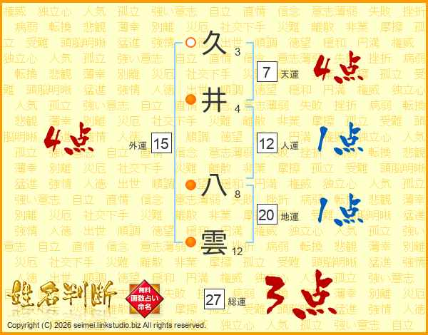 生活面を象徴する運勢です。外部から受ける影響力を表し、結婚運、家庭運や職場、環境への順応性を表します。総運から人運を引いた画数。姓や名が1文字の場合を除く。