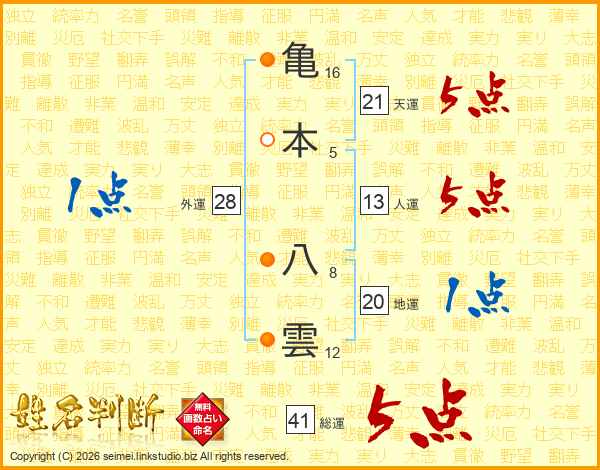 亀本八雲さんの天運は21画の5点!