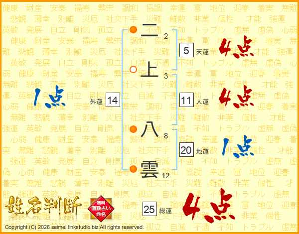 二上八雲さんの総運は25画の4点!