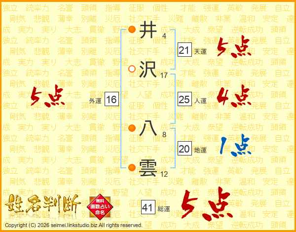 井沢八雲さんの総運は41画の5点!