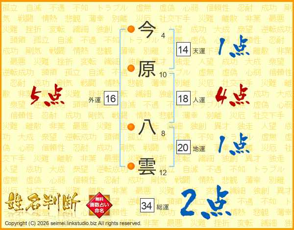 生活面を象徴する運勢です。外部から受ける影響力を表し、結婚運、家庭運や職場、環境への順応性を表します。総運から人運を引いた画数。姓や名が1文字の場合を除く。