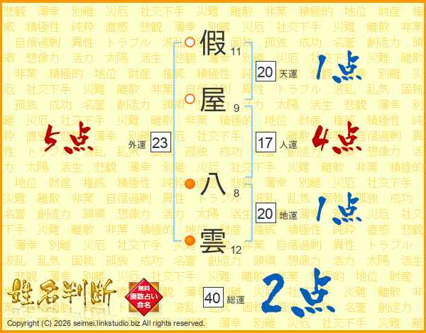 生活面を象徴する運勢です。外部から受ける影響力を表し、結婚運、家庭運や職場、環境への順応性を表します。総運から人運を引いた画数。姓や名が1文字の場合を除く。