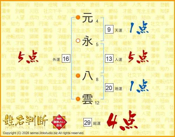 元永八雲さんの人運は13画の5点!