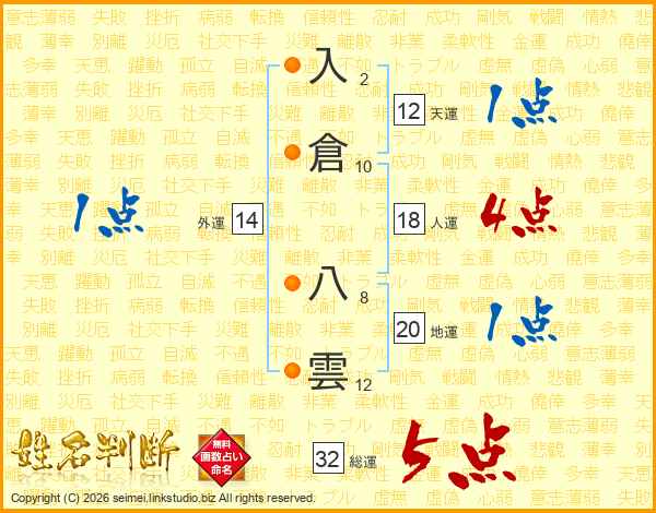 入倉八雲さんの総運は32画の5点!