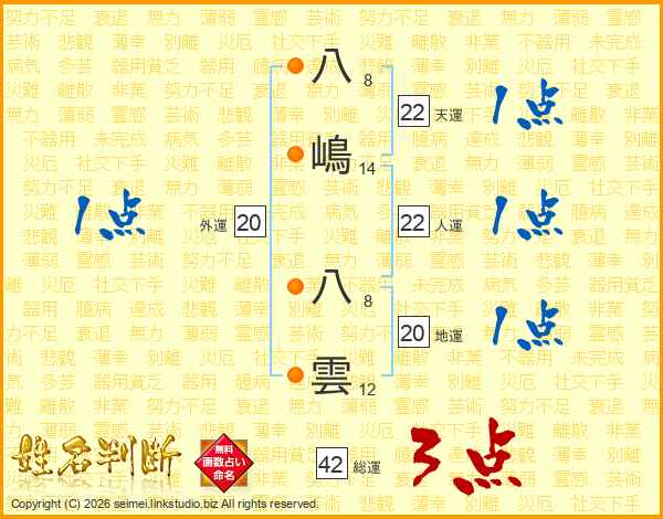 八(8画)嶋(14画) 八(8画)雲(12画)