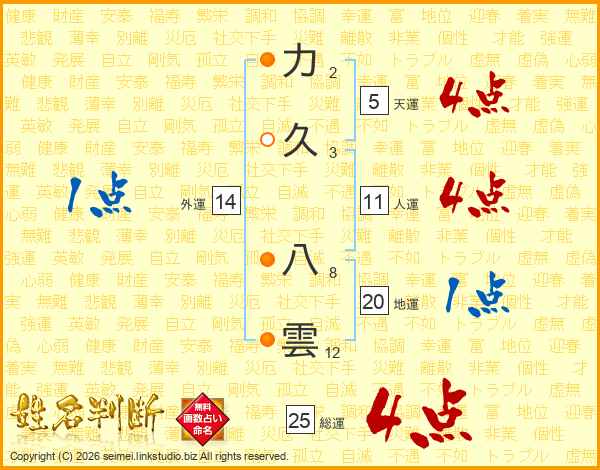 力久八雲さんの総運は25画の4点!