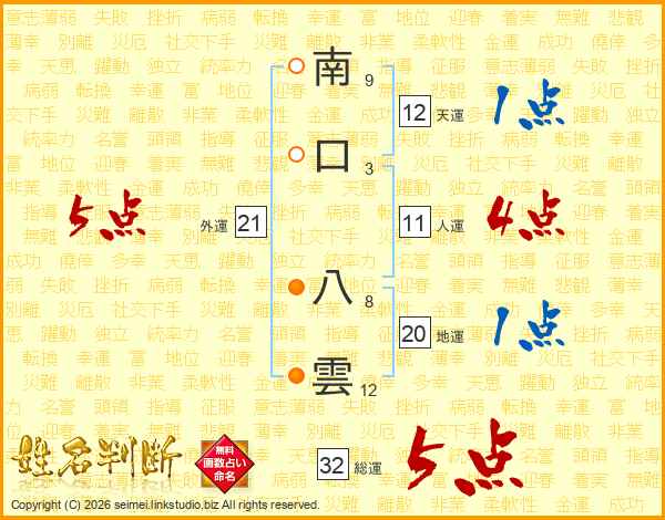 生活面を象徴する運勢です。外部から受ける影響力を表し、結婚運、家庭運や職場、環境への順応性を表します。総運から人運を引いた画数。姓や名が1文字の場合を除く。