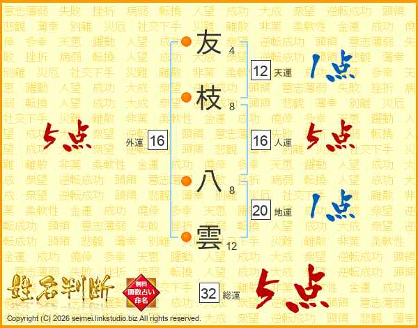 生活面を象徴する運勢です。外部から受ける影響力を表し、結婚運、家庭運や職場、環境への順応性を表します。総運から人運を引いた画数。姓や名が1文字の場合を除く。