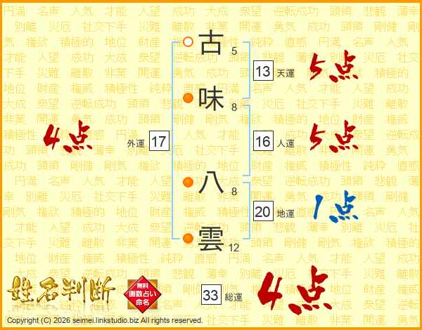 古味八雲さんの総運は33画の4点!