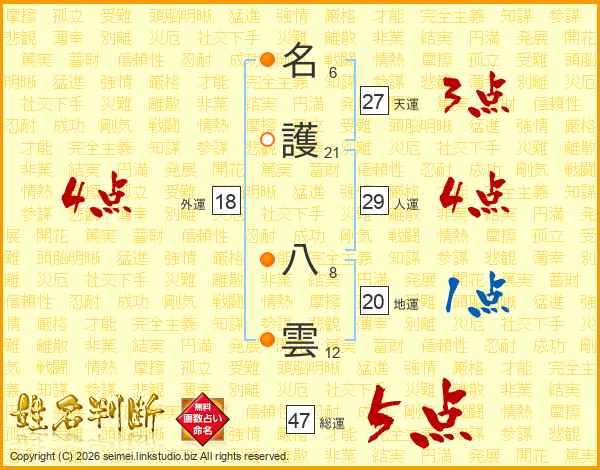 名(6画)護(21画) 八(8画)雲(12画)