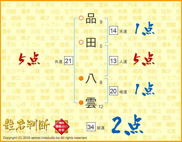 品田八雲さんの総運は34画の2点!